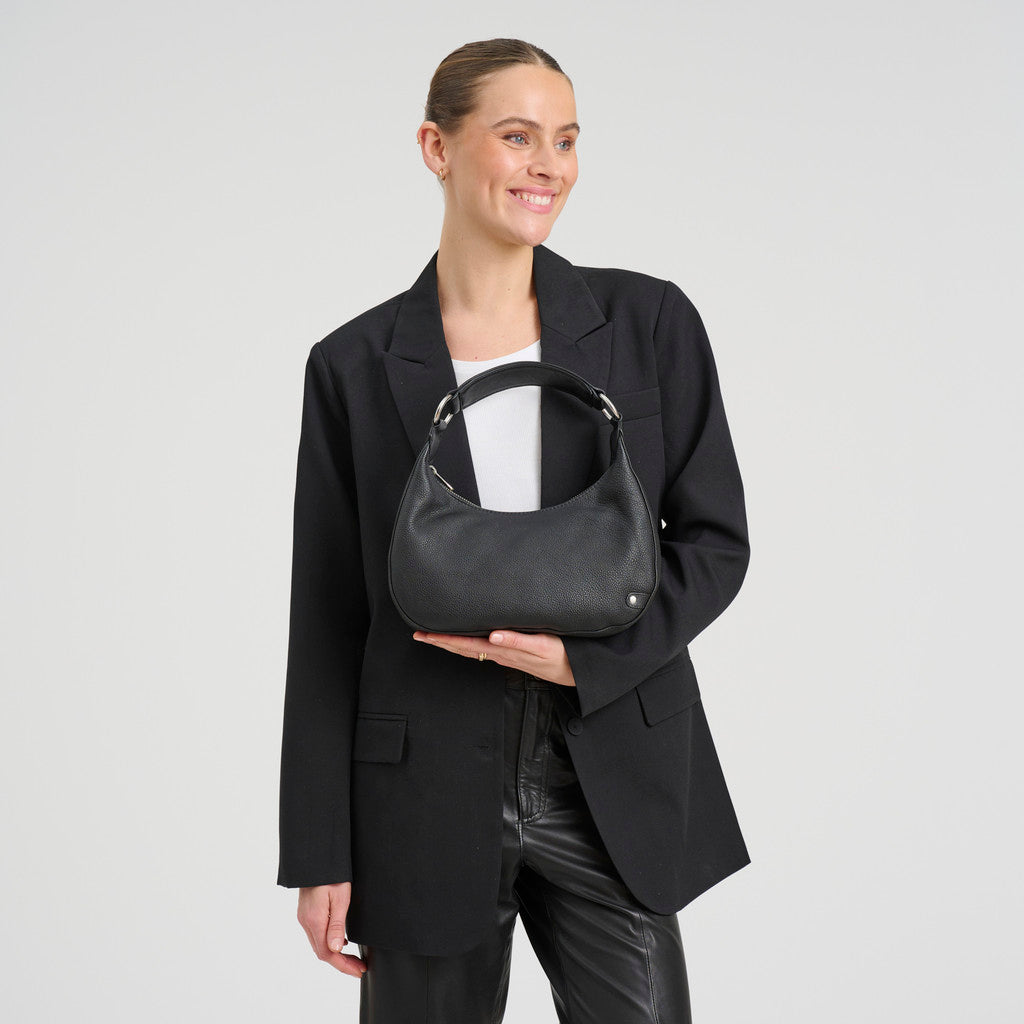 The bag closes with a top zipper, keeping your belongings secure. Inside, it includes a small zip pocket and two open slip pockets, making it easy to organise your essentials such as your phone, keys, and cards.