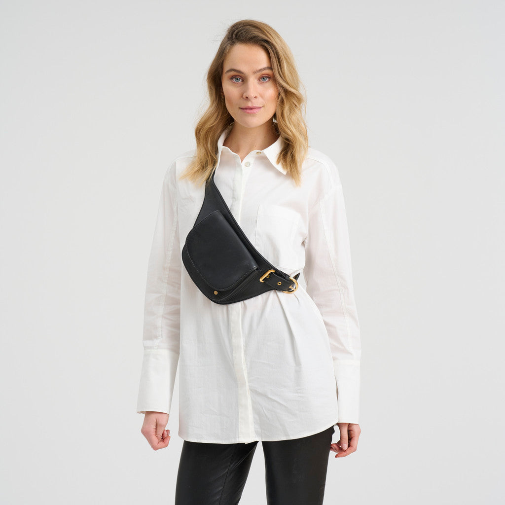 The bag closes with a hidden magnetic button beneath the flap, ensuring both security and easy access on the go. Its compact size is ideal for carrying your essentials such as your phone, keys, and small accessories. The adjustable crossbody strap allows you to style it exactly as you prefer - as a bumbag, over the shoulder, or crossbody.