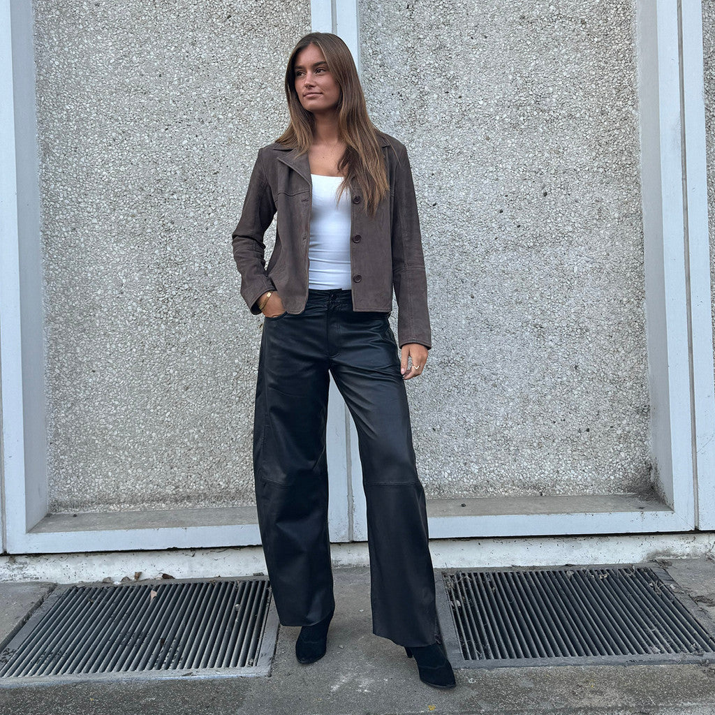The Boel barrel trousers are one of the season’s hottest trends and a must-have for any wardrobe. Crafted from the softest lamb leather, they offer a luxurious and exclusive look. With their roomy barrel leg, relaxed fit, and full length, these trousers create a cool and modern silhouette that can easily be dressed up or down.